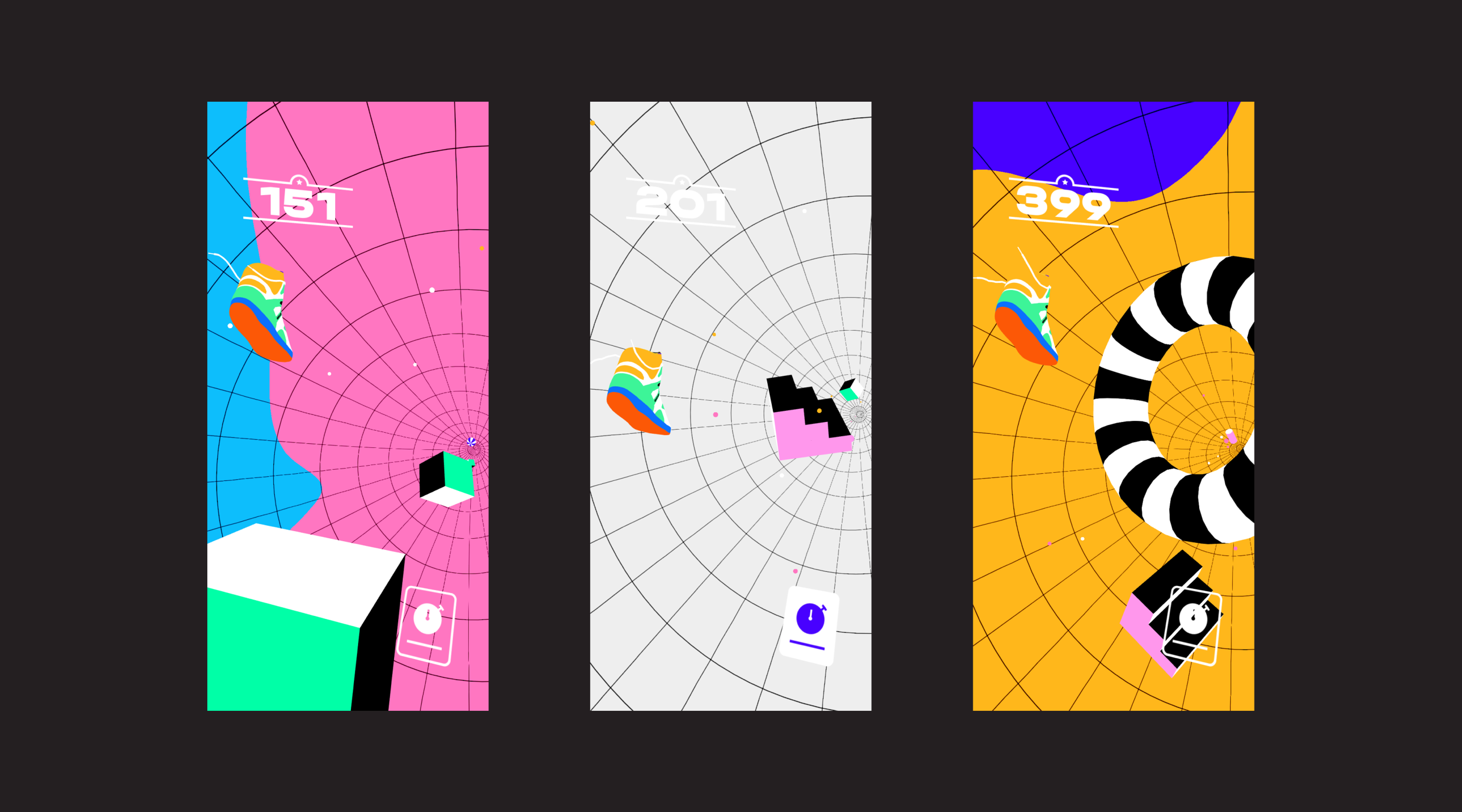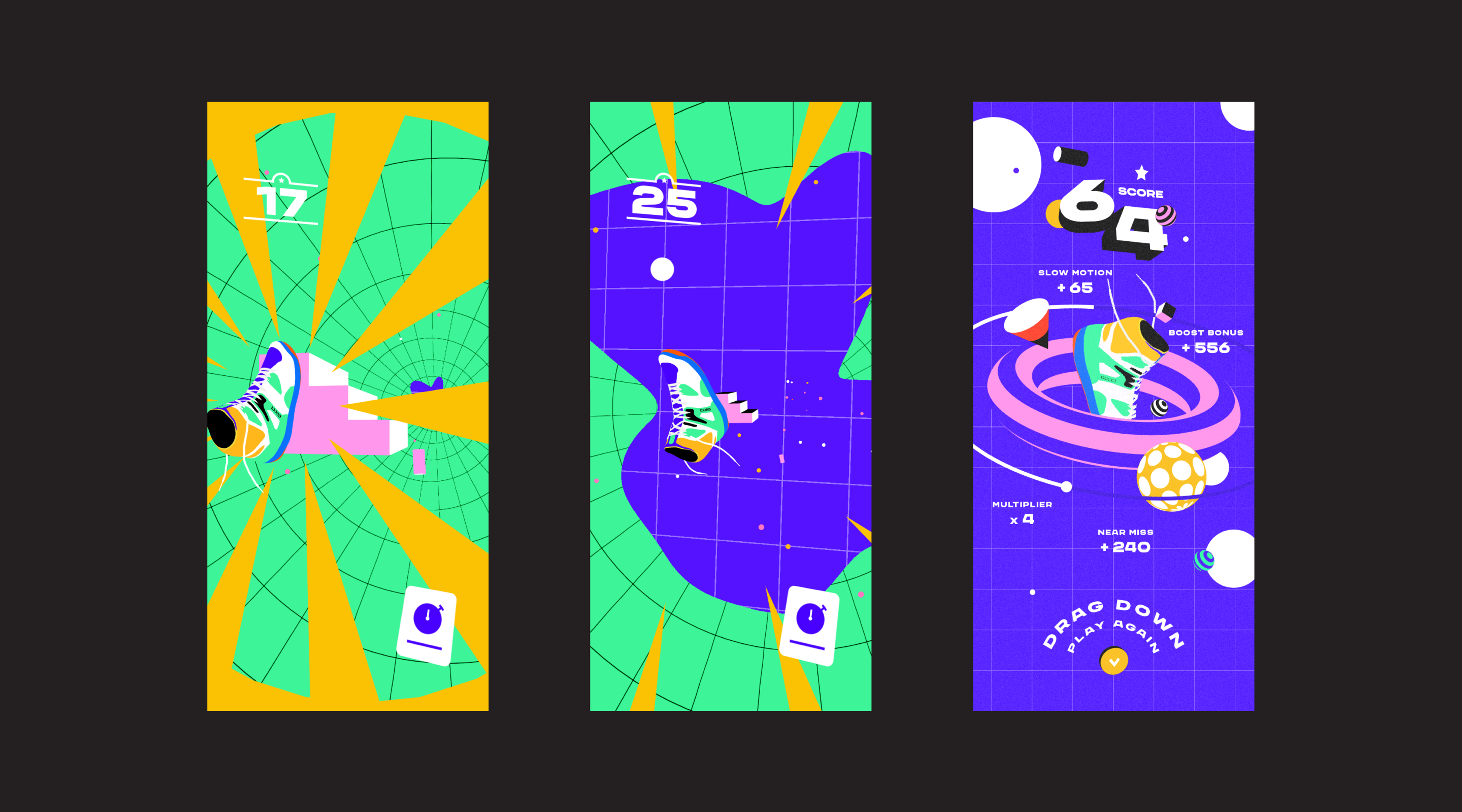 A fun, dynamic game with multiple levels of increasing difficulty to launch the new Gucci Basket sneaker. Inspired by the colourful shoes themselves in combination with Memphis design direction.